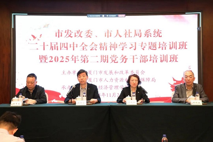 为深入学习贯彻党的二十届四中全会精神,筑牢党务干部政治根基,提升党建工作履职能力,11月26日至28日,由市发改委、市人社局联合主办,厦门经济管理学院承办的市发改委、市人社局系统党的二十届四中全会精神学习专题培训班暨2025年第二期党务干部培训班在厦门宾馆举办。本次培训以“理论武装+实践赋能+交流互鉴”三维模式,为50名参训学员奉上了一场内涵丰富、务实管用的“充电盛宴”。